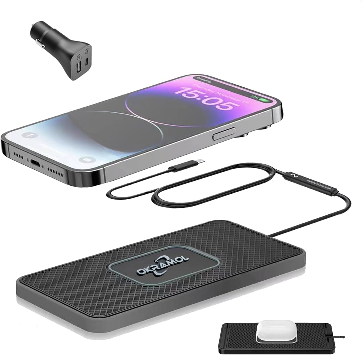 Military grade slip mat suction:Suitable for flat surfaces, the silicone rubber material prevents the charging mat from sliding around while preventing your iPhone (large screen) from moving. Whether on rough roads or in speed bumps, it prevents your phone from falling and ensures a great charging experience. The rectangular area in the center ensures that your AirPods are precisely positioned for charging