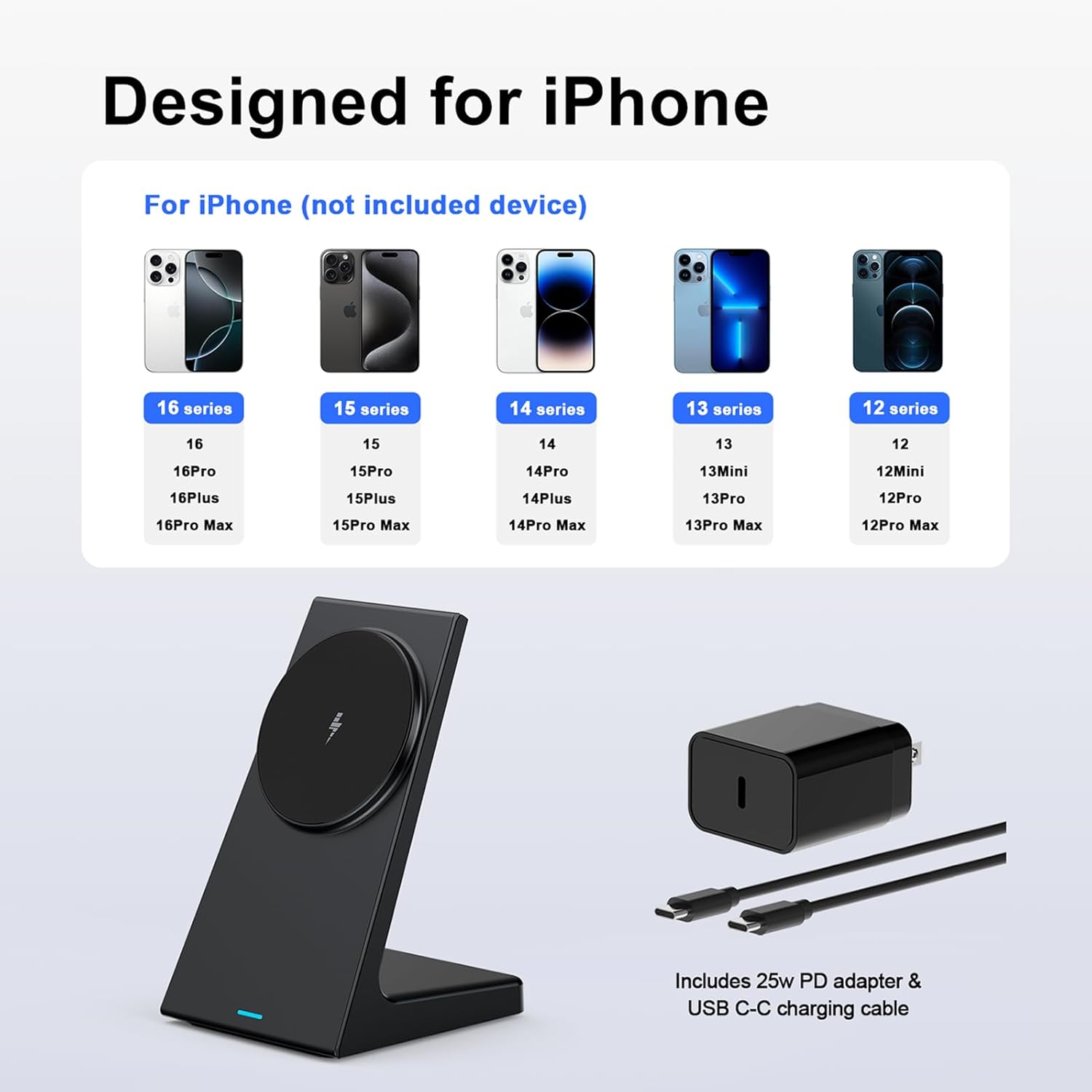 📱【Designed for iphone】:Magnetic wireless charger stand is compatible withiPhone 17, 17 Pro, 17 Plus, 17 Pro Max ,iPhone 16, 16 Pro, 16 Plus, 16 Pro Max,15, 15 Pro, 15 Plus, 15 Pro Max, iPhone 14, 14 Pro, 14 Plus, 14 Pro Max, iPhone 13, 13 Pro, 13 Pro Max, 13 Mini, and iPhone 12, 12 Pro, 12 Pro Max, 12 mini and AirPods 3, Pro 2 and Pro series. Tips: The mag-safe charger for iPhone only supports thin silicone phone cases less than 0.15 in thick. For stronger magnetism and faster charging, we recommend using the included adapter and removing the case before charging, or using a compatible with mag-safe case.Note: Support Mag-Safe case to charge your device.