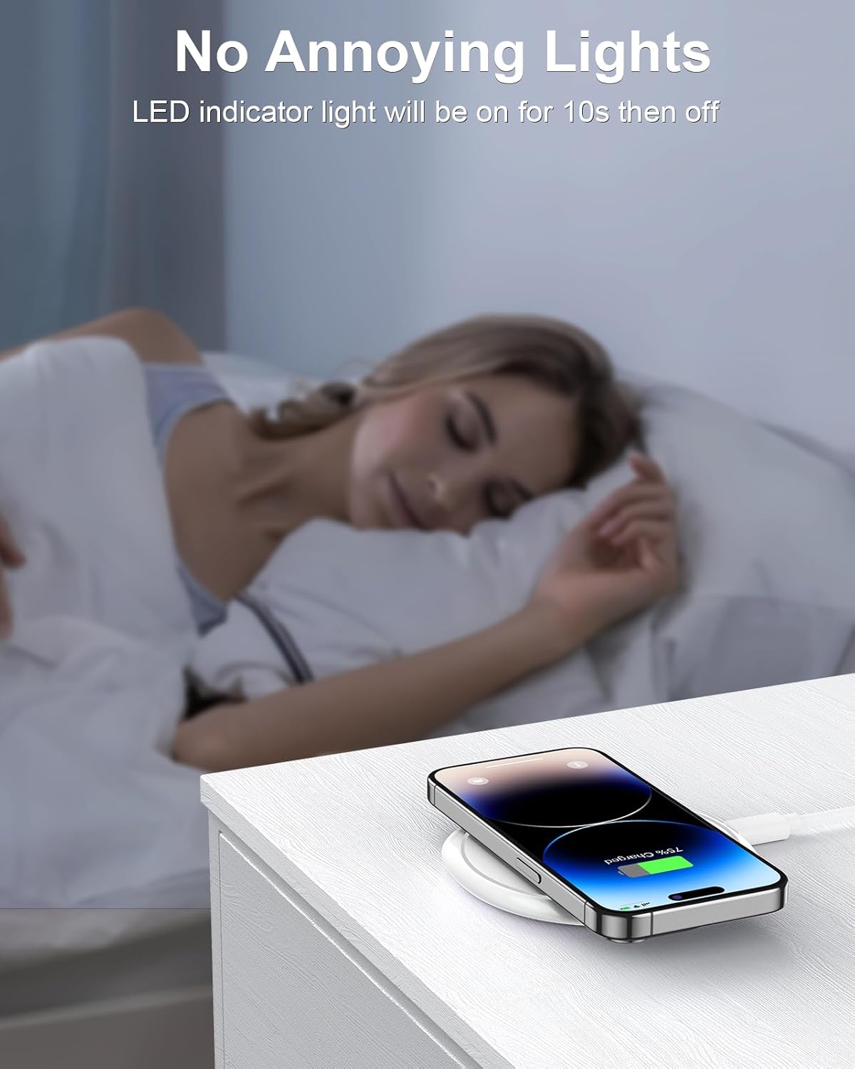 Intelligent Design: Exclusive Multifunctional Intelligent Protect Technology provides temperature control, surge protection, short-circuit prevention, and more. Smart Wireless charger LED indicator will turn on for 10 seconds when placing charging then go off during the charging process, no disturbing light for your sweet sleep.