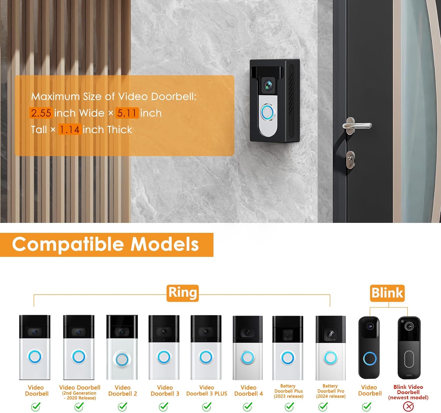 Universal Compatibility: Fits Ring doorbell models Wireless/2/3/3 Plus/4/(2020/2023/2024 Release) and Blink Doorbell1st Gen Mount, 𝗡𝗼𝘁 𝗰𝗼𝗺𝗽𝗮𝘁𝗶𝗯𝗹𝗲 𝘄𝗶𝘁𝗵 𝐁𝐥𝐢𝐧𝐤 𝐕𝐢𝐝𝐞𝐨 𝐃𝐨𝐨𝐫𝐛𝐞𝐥𝐥 𝟮𝗻𝗱 𝗚𝗲𝗻𝗲𝗿𝗮𝘁𝗶𝗼𝗻 (𝟮𝟬𝟮𝟱 𝗡𝗲𝘄 𝗥𝗲𝗹𝗲𝗮𝘀𝗲). (Doorbell NOT included).