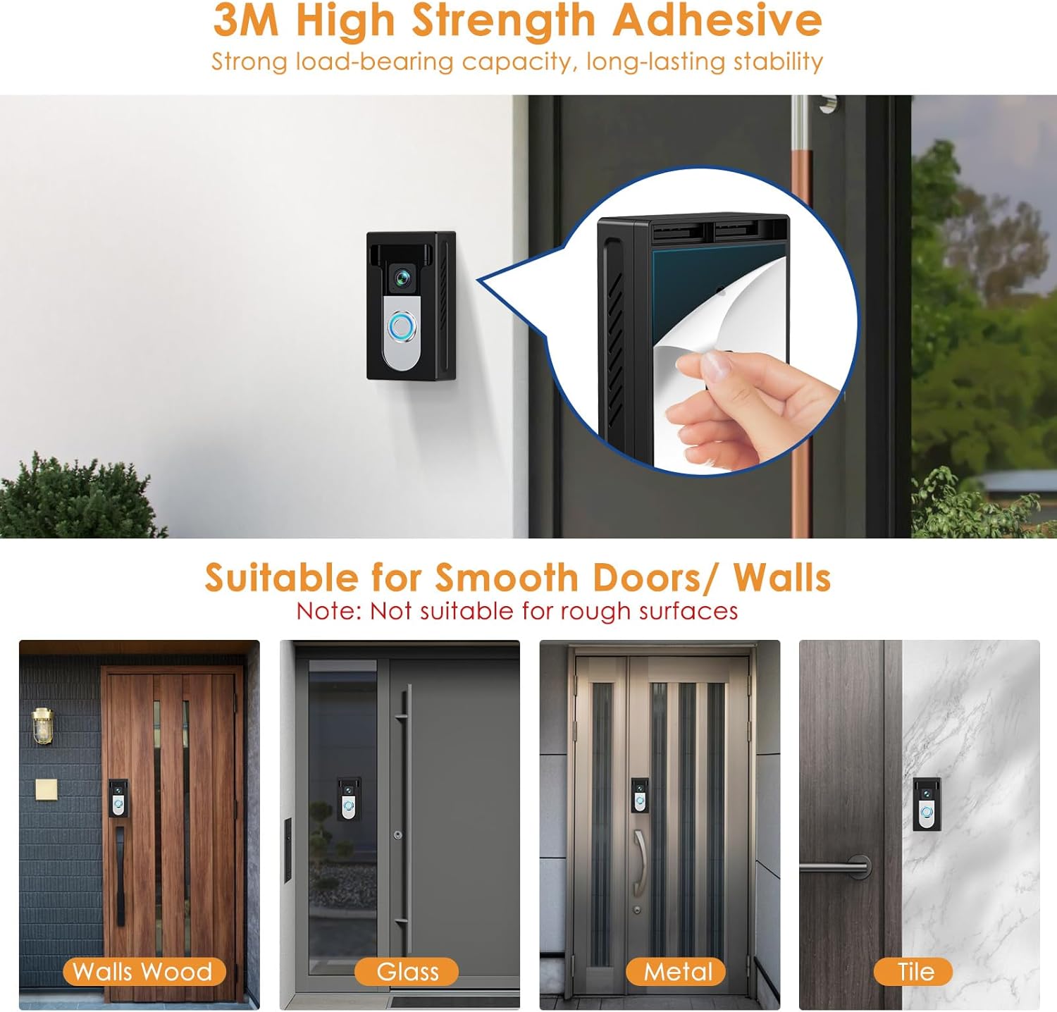 Ideal Surfaces: The camera doorbell mount is best on smooth surfaces like metal, marble, glass, and wood; not suitable for brick or rough concrete.