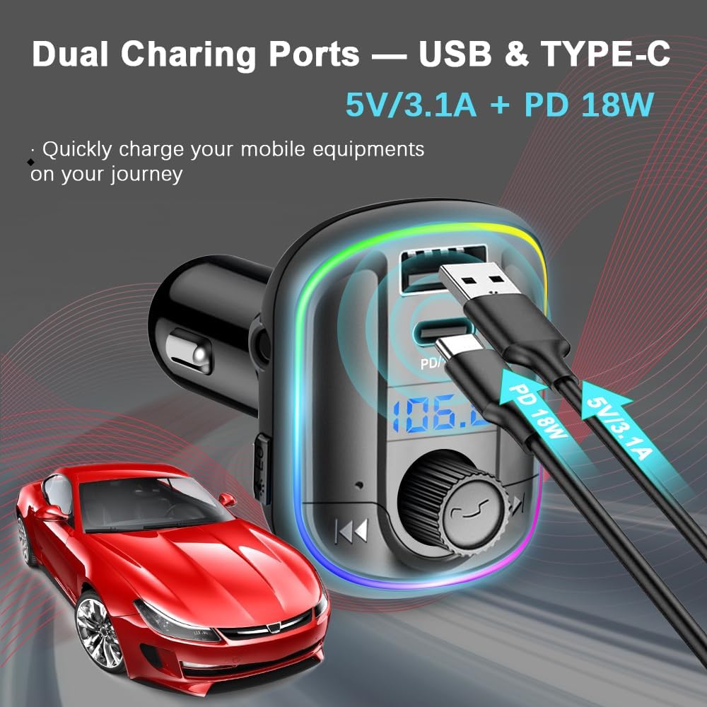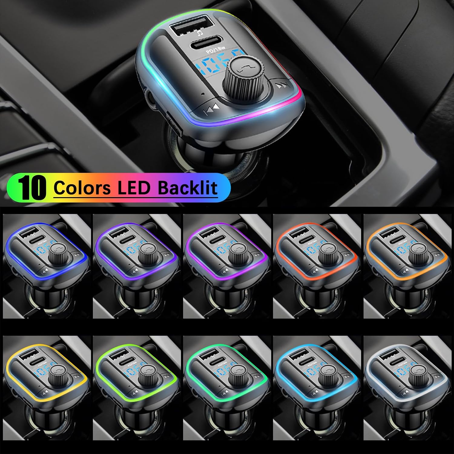 10 Colors LED Backlit Version: It supports 10 colors LED backlit lights, including green/red/blue/yellow/cyan/purple and etc. This FM radio transmitter offers you a visually enjoyment, which is a nice way to match the colors alreay in the car. The backlit could be turned off while driving at night to avoid disturbing.