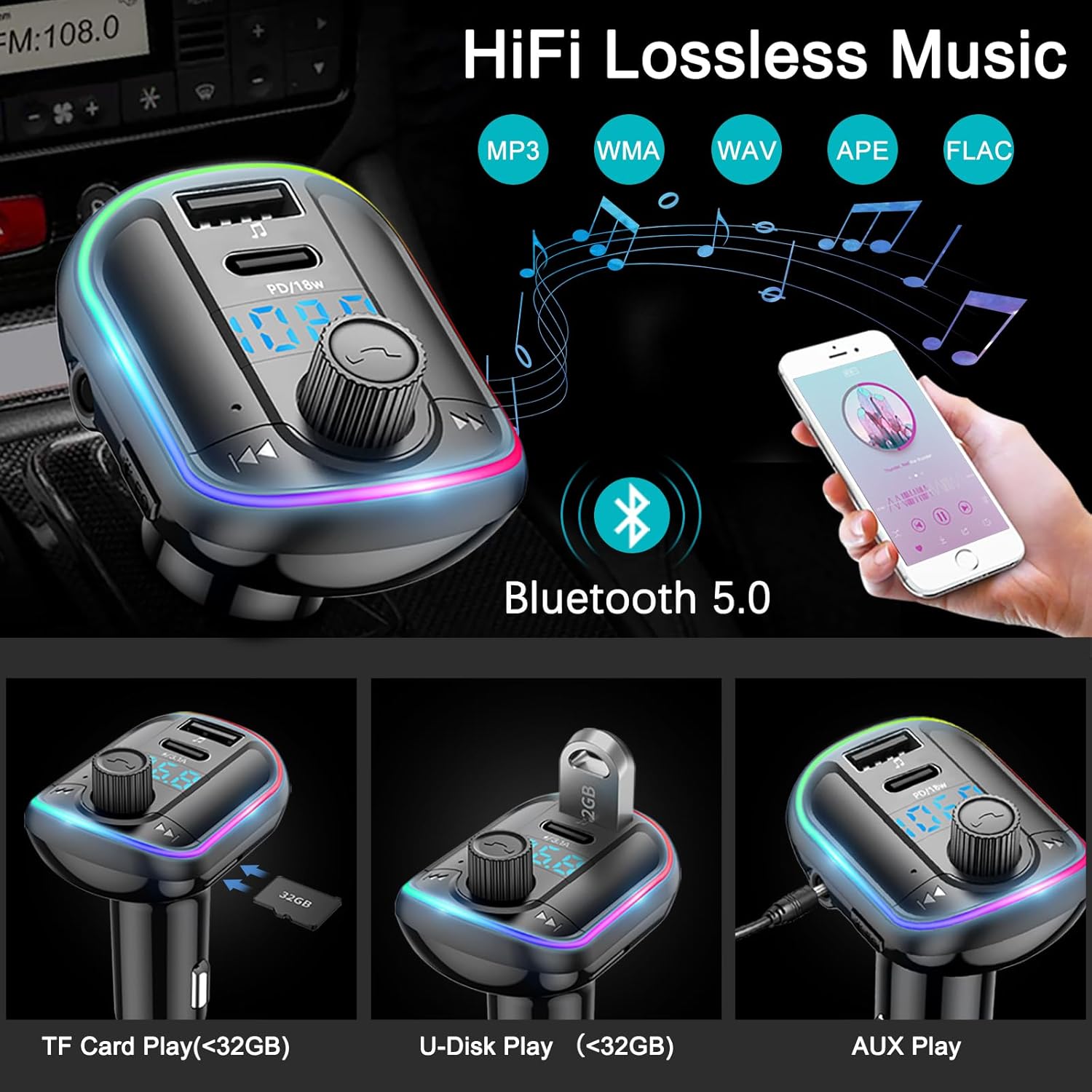 HiFi Music Streaming: You can enjoy music on your car stereo via Bluetooth / USB Flash Drive (32GB) / Micro SD Card (32GB) / 3.5mm Aux Audio Cable. It supports Bass music effect.