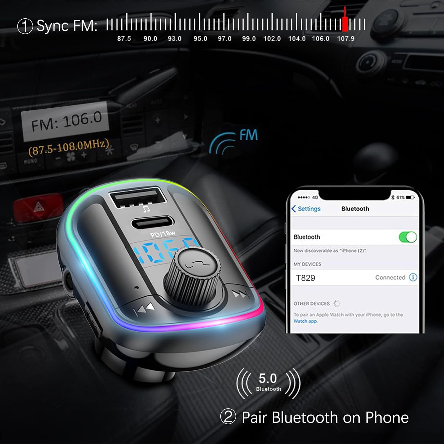 How to Use: ① Turn on the car radio and adjust to a blank channel from 88.1 to 108MHz. ② Plug into car cigarette lighter, and adjust it to a same channel as car radio. ③ Pair with T829 signal on phone Bluetooth. ④ Work.