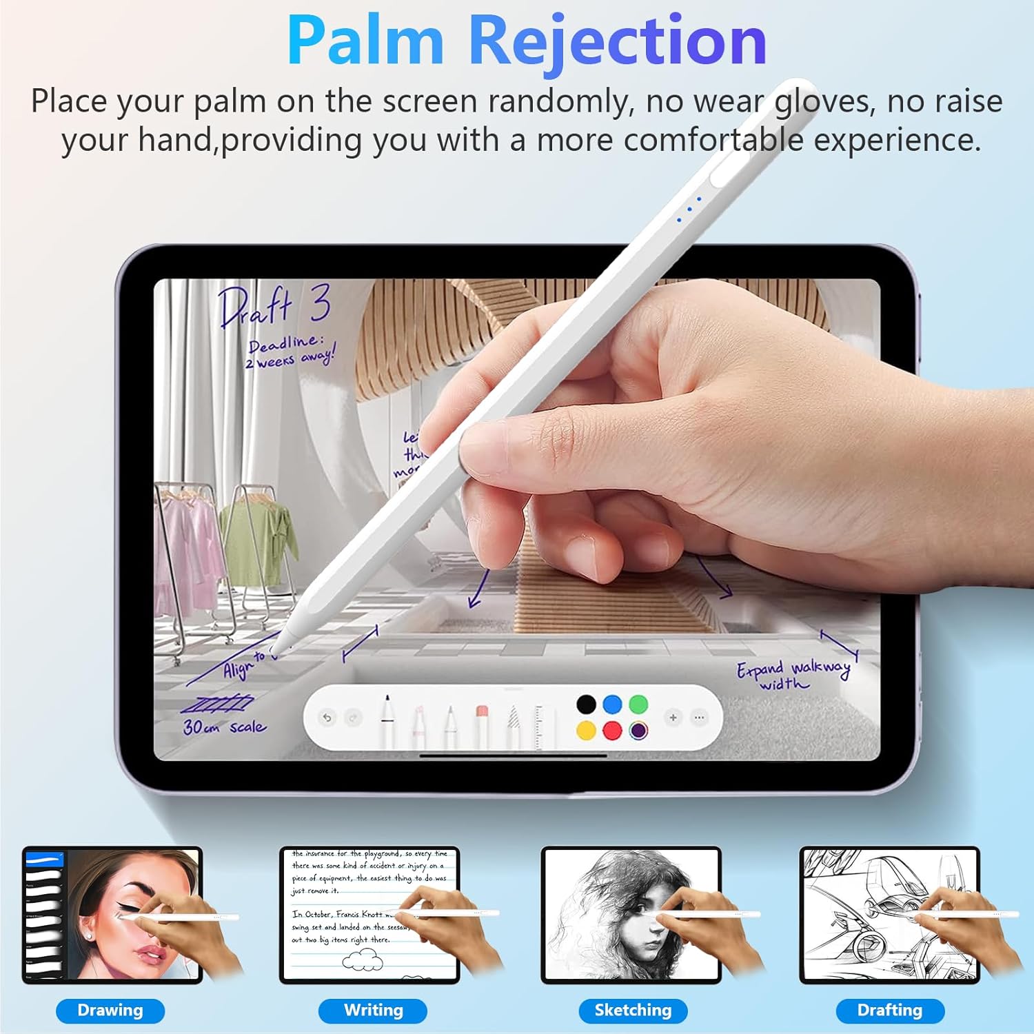 Stylus Pen for iPad 2018-2025, 15 Mins Fast Charge for Apple Pencil with Palm Rejection, Compatible with iPad 11/10/9/8/7/6, Pro M4/12.9″(6/5/4/3)/11″, Air M3/M2/5/4/3, Mini A17 Pro/6/5,White