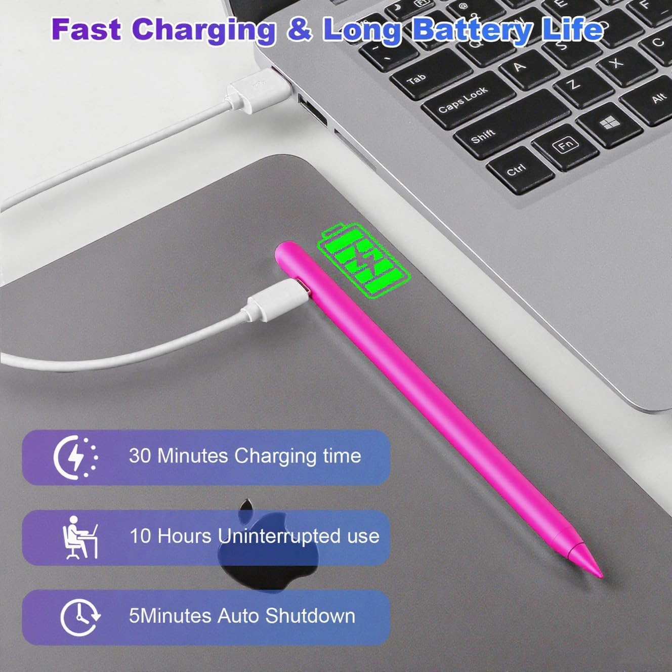 【Auto-Sleep & Fast Charging iPad Pen】 Our iPad pencil only takes 20-25 Minutes to fully charge and work for 8 hours continuously.The Stylus Pen will automatically enter sleep mode after five minutes of inactivity to save power energy efficiently.Simply touch the top of the pen to wake it up.