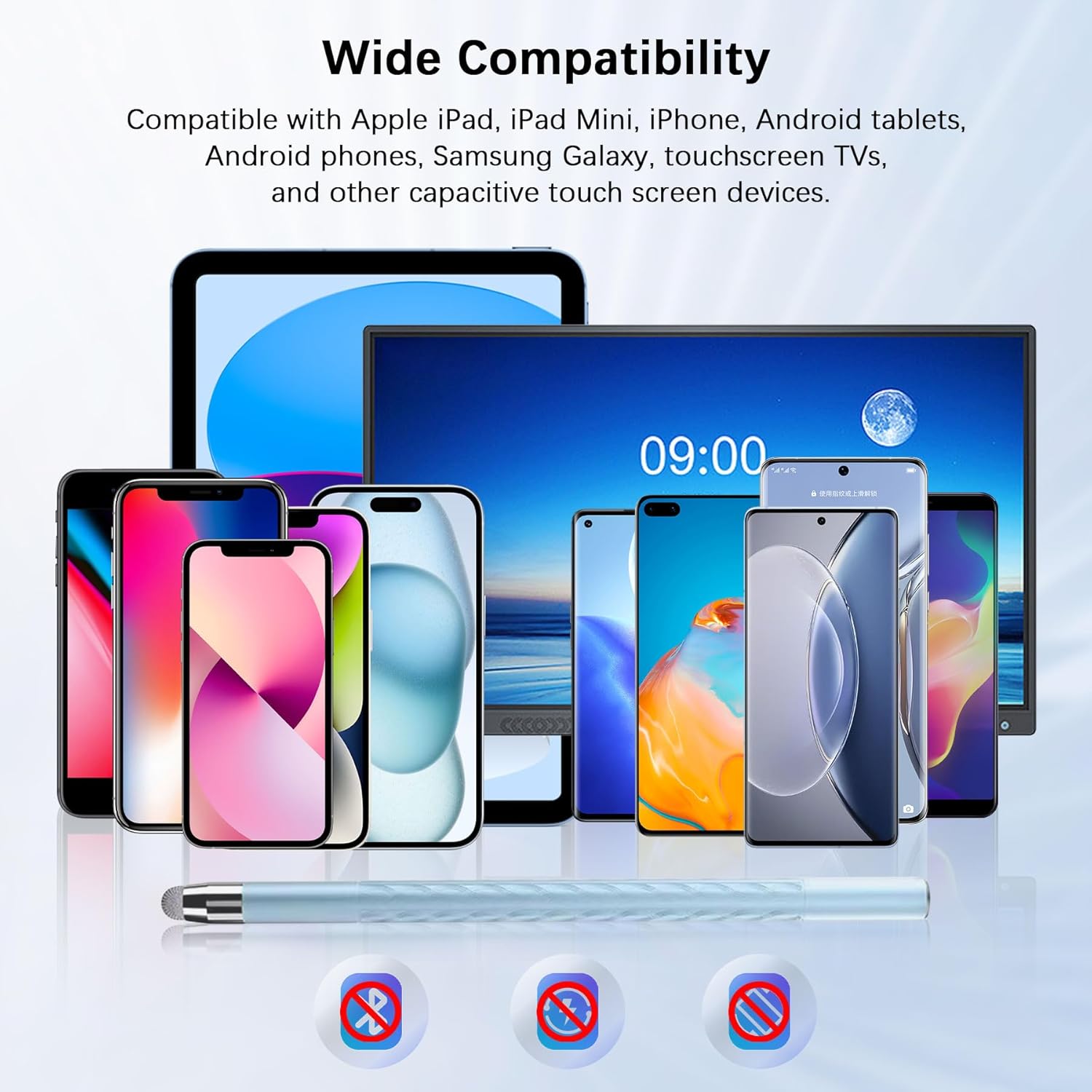 Wide Compatibility: No battery required. It is compatible with all touch screen devices such as iPad, iPhone, smartphones, tablets, laptops, and televisions.