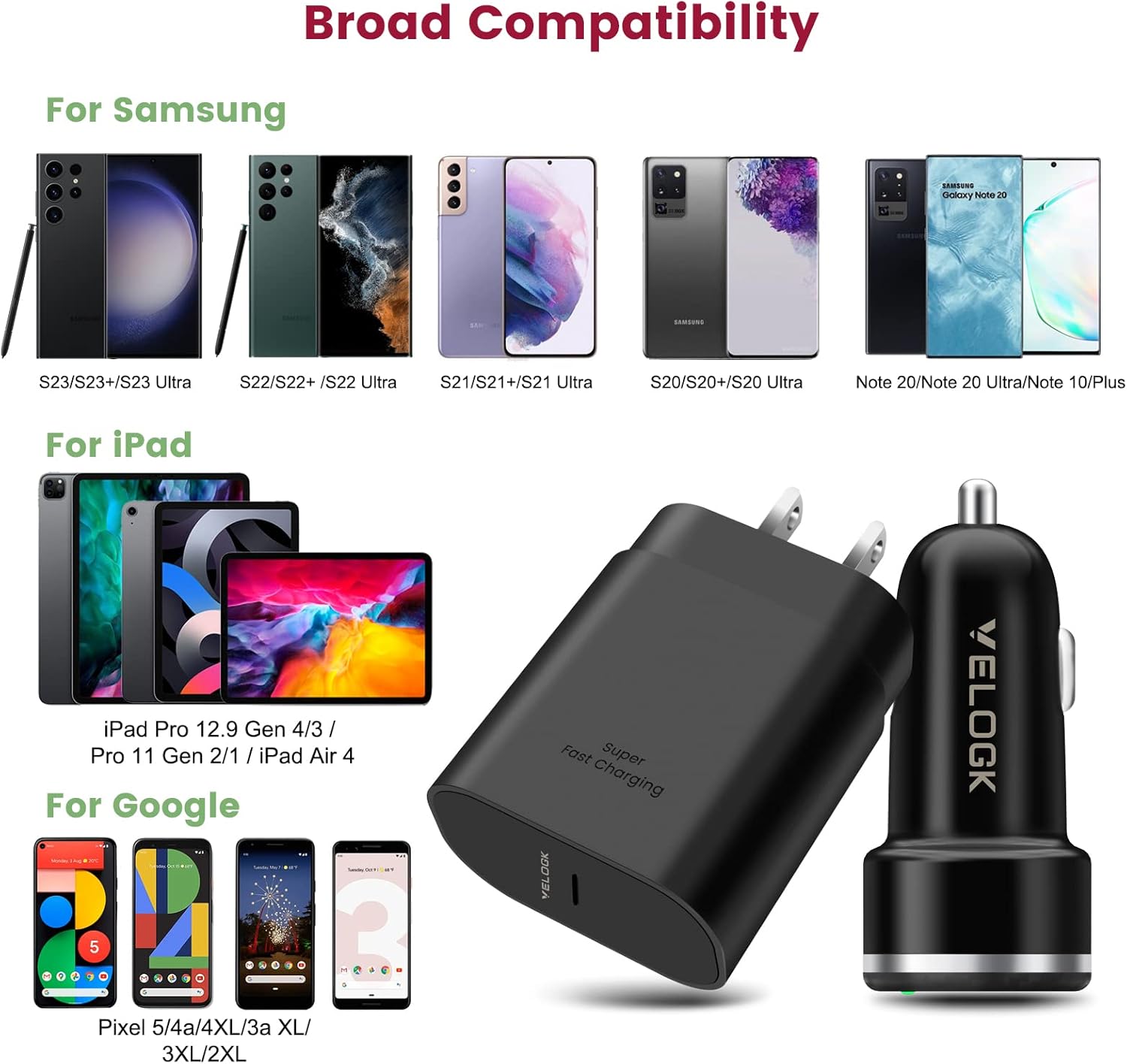【25W Super Fast Type C Charger Combo Kit】- Equipped with max 25W PPS/PD type-c port on both wall and car charger, this Samsung USB C Charger kit is tailor made for [Super Fast Charging] Samsung Galaxy S25/S25+/S25 Ultra/S24/S24+/S24 Ultra/S23/S23+/S23 Ultra/S22/S22+/S22 Ultra/S21/S21+/S21 Ultra/FE 5G/S20/S20+/S20 Ultra/Note 10+/Note 20 Ultra/Z Flip, also provides optimized charging for 2021/2020/2018 iPad Pro 12.9 Gen 5/4/3, Pro 11 Gen 3/2/1, iPad Air 4, Google Pixel 6/6 Pro/5/5a and more..