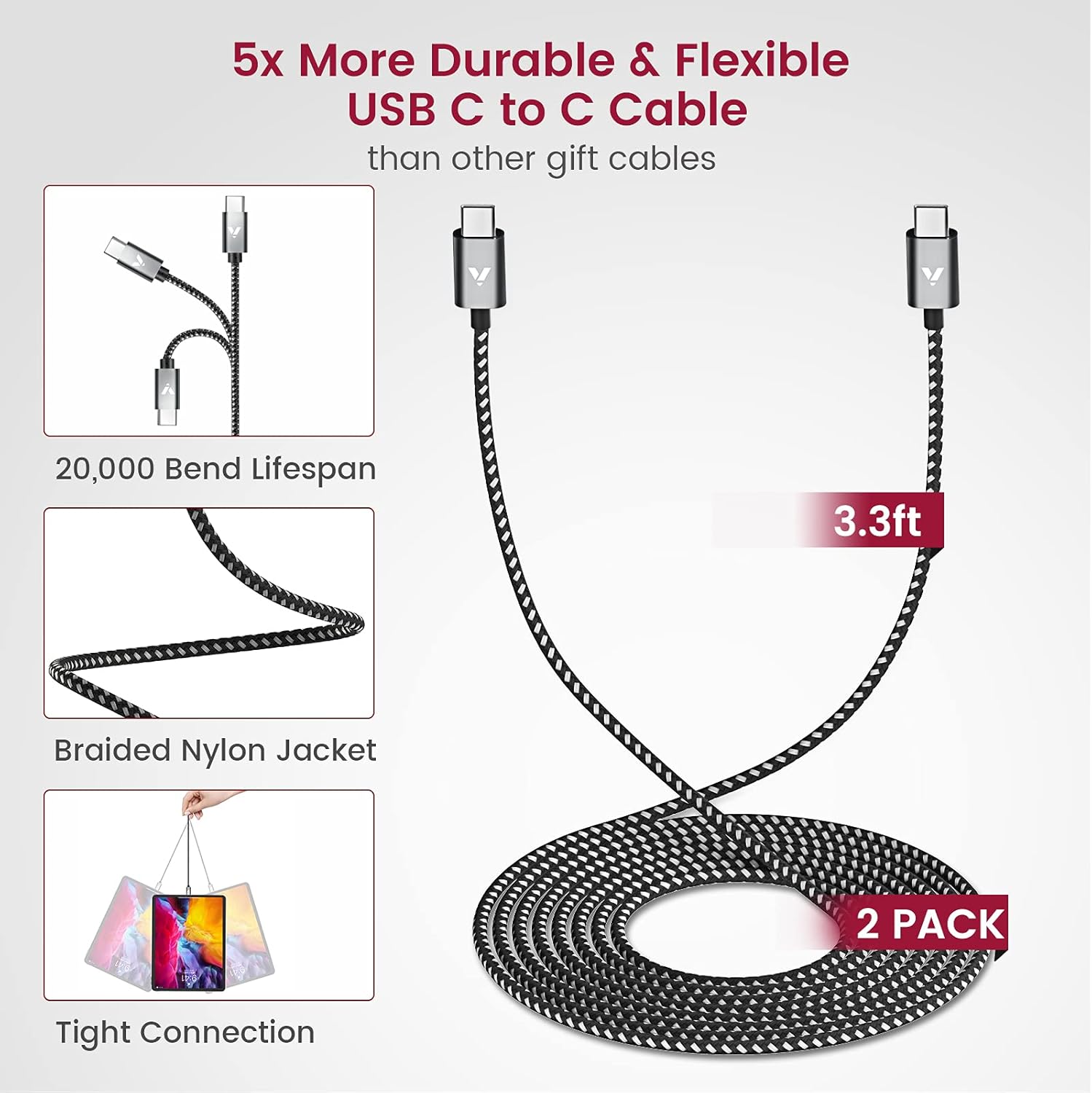 【5x Durable USB C to USB C Cable Attached】- Included 2 PACK Type C to C cable braided with strong Nylon material, 5x more durable than other gift cables, STOP wasting your money on changing cables from now on. Output 3A high power and supports data transfer up to 480Mbps.