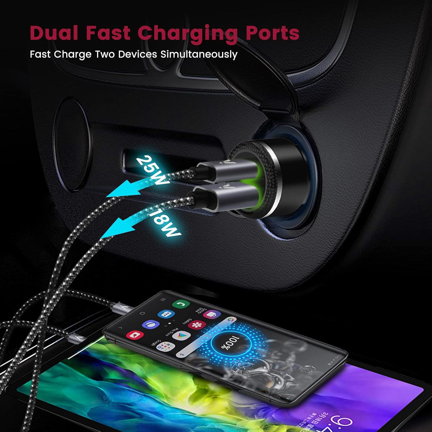【Simultaneously Fast Charge On The Road】- Dual-port super fast car charger delivers 43W max power in total one time from two ports(25W on PD/PPS port, 18W on QC3.0 port), no need to sacrifice charging speed when charging two devices simultaneously. No more fighting for juice on the road, allows your kids to freely abandon boredom on Switch or iPad while super fast charging your Samsung Galaxy S25/S24/S23/S22/S21 at the same time.