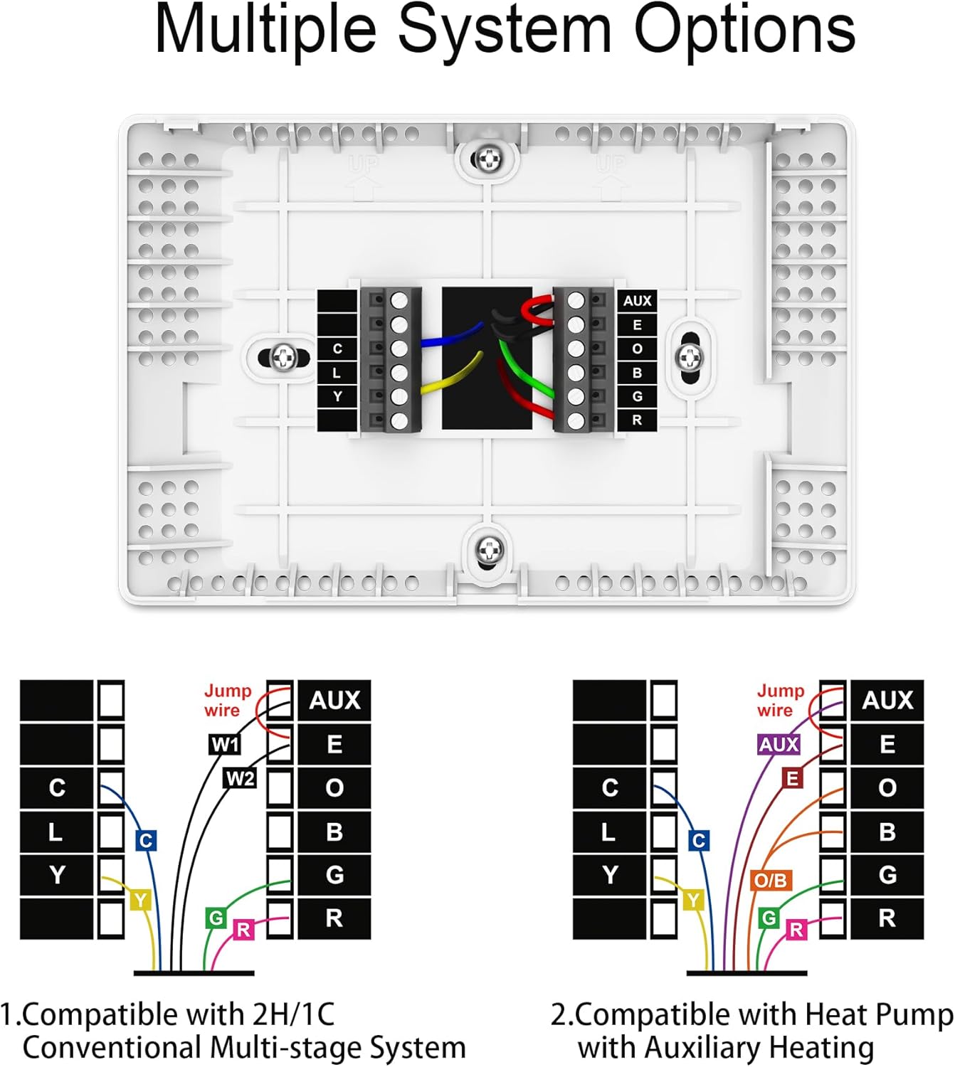 【Wide Compatibility】This programmable thermostat supports conventional multi-stage systems and heat pump systems up to (2H/1C) (C-wire required), and is also compatible with single-stage heating and cooling systems, heat pumps without auxiliary heating, hydronic heating, boilers, gas fireplaces (24V), and 750 millivolt systems. Works seamlessly with gas, electric, and oil furnaces. Note: Before making a purchase, please ensure that the product description match your requirements.