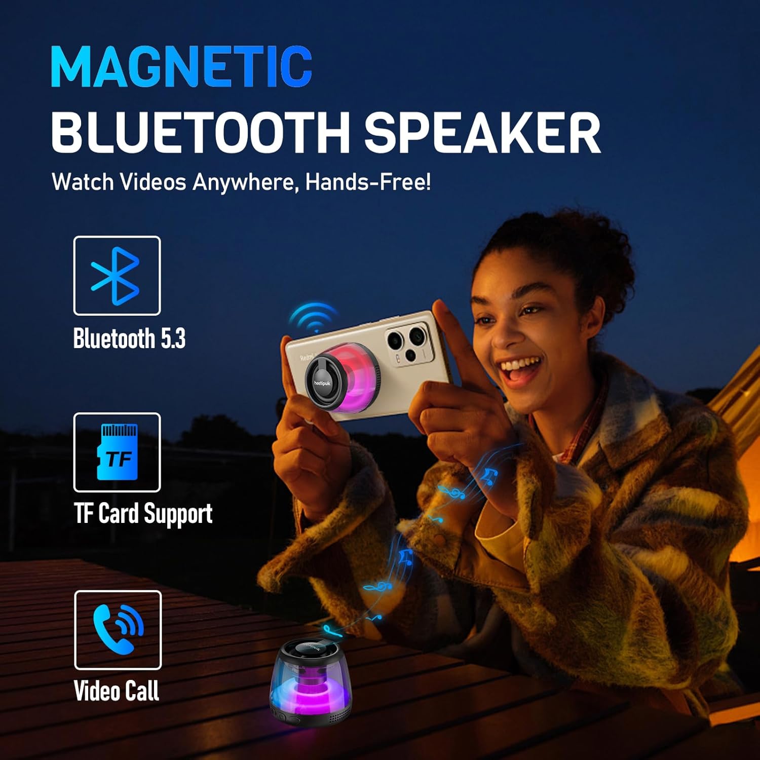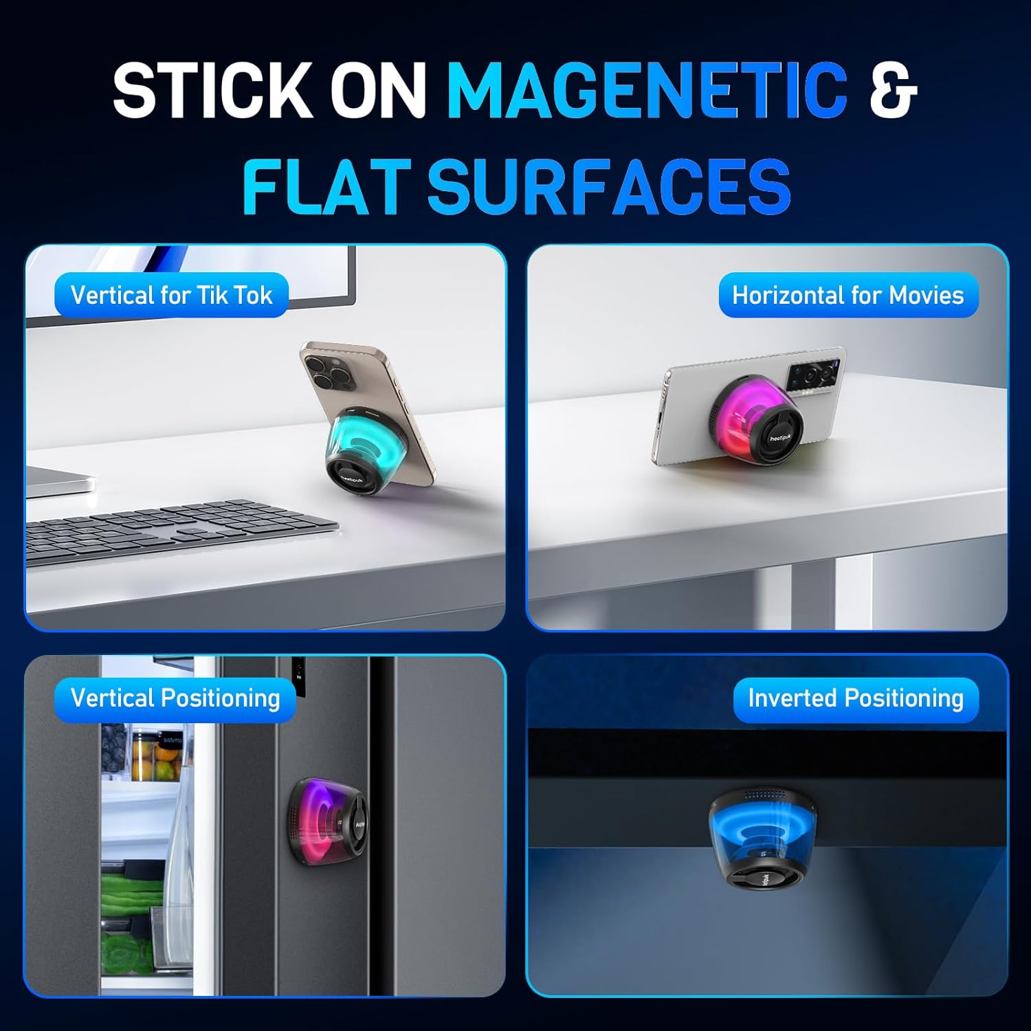 【It Will Stick Wherever You Are】This mini bluetooth speaker features a unique magnetic base that can stick to any magnetic metal surface. So the portable speaker can attach to fitness equipment, refrigerator, or golf cart metal bars. You can use the included magnetic ring to stick wireless bluetooth speaker to a flat surface that has no magnetism,like phone without magnetism or phone case, bathroom door. This induction speaker for phone can serve as a phone stand for horizontal or vertical.