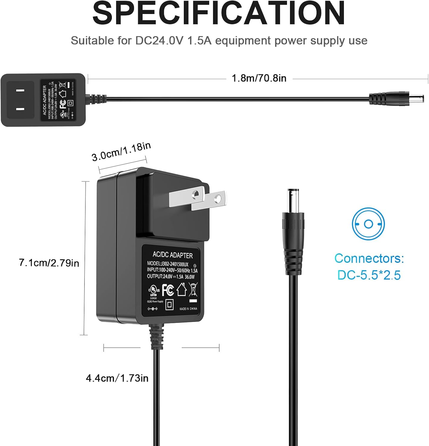 [ 24V DC Power Supply Overview: ] 24V 1.5A power adapter Worldwide Input Voltage: AC 100V-240V 50-60Hz Output Voltage: DC 24V, 1.5A, 36W, 24V Power Cord / Cable Length: 6 Ft /1.8m