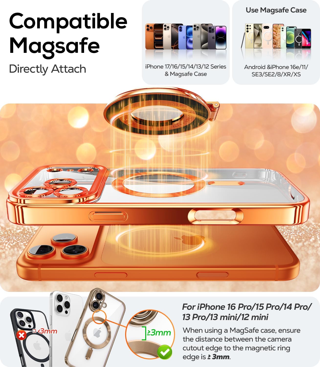 Compatible with MagSafe: This MagSafe ring stand is designed specifically for use with MagSafe devices and certified MagSafe cases, including iPhone 17/16/15/14/13/12 Series. For non-MagSafe devices, please use a magsafe/magnetic case:iPhone 11/11Pro/X/XS/XS Max/8/7, Samsung Galaxy, Google Pixel, etc. (Note:iPhone 16 Pro/ 15 Pro/ 14 Pro/ 13 Pro/ 13 mini/12 mini, can be used with the phone ring holder directly. If wearing a magnetic case, the distance between the magnetic ring and the camera should be≦3mm)