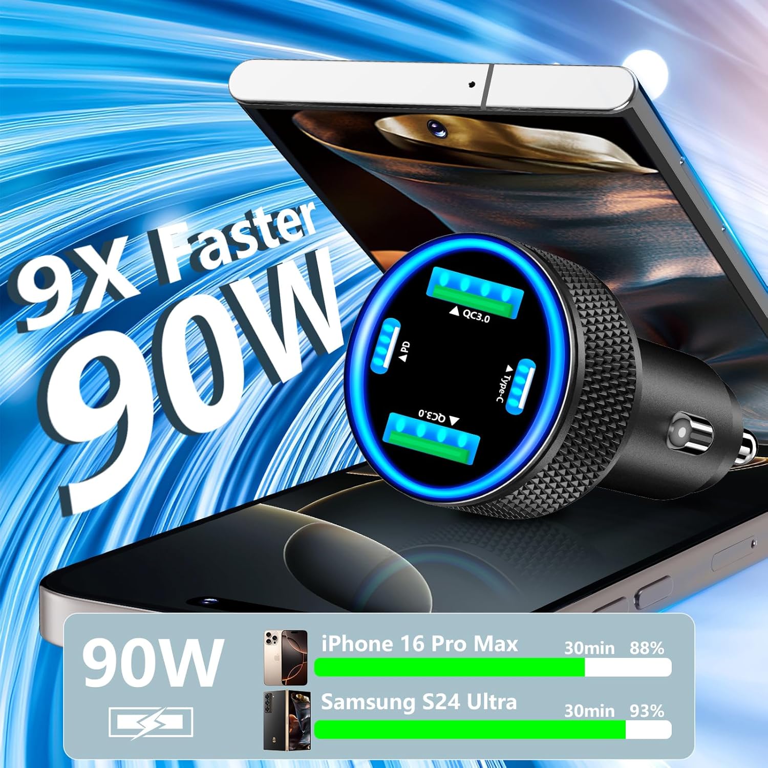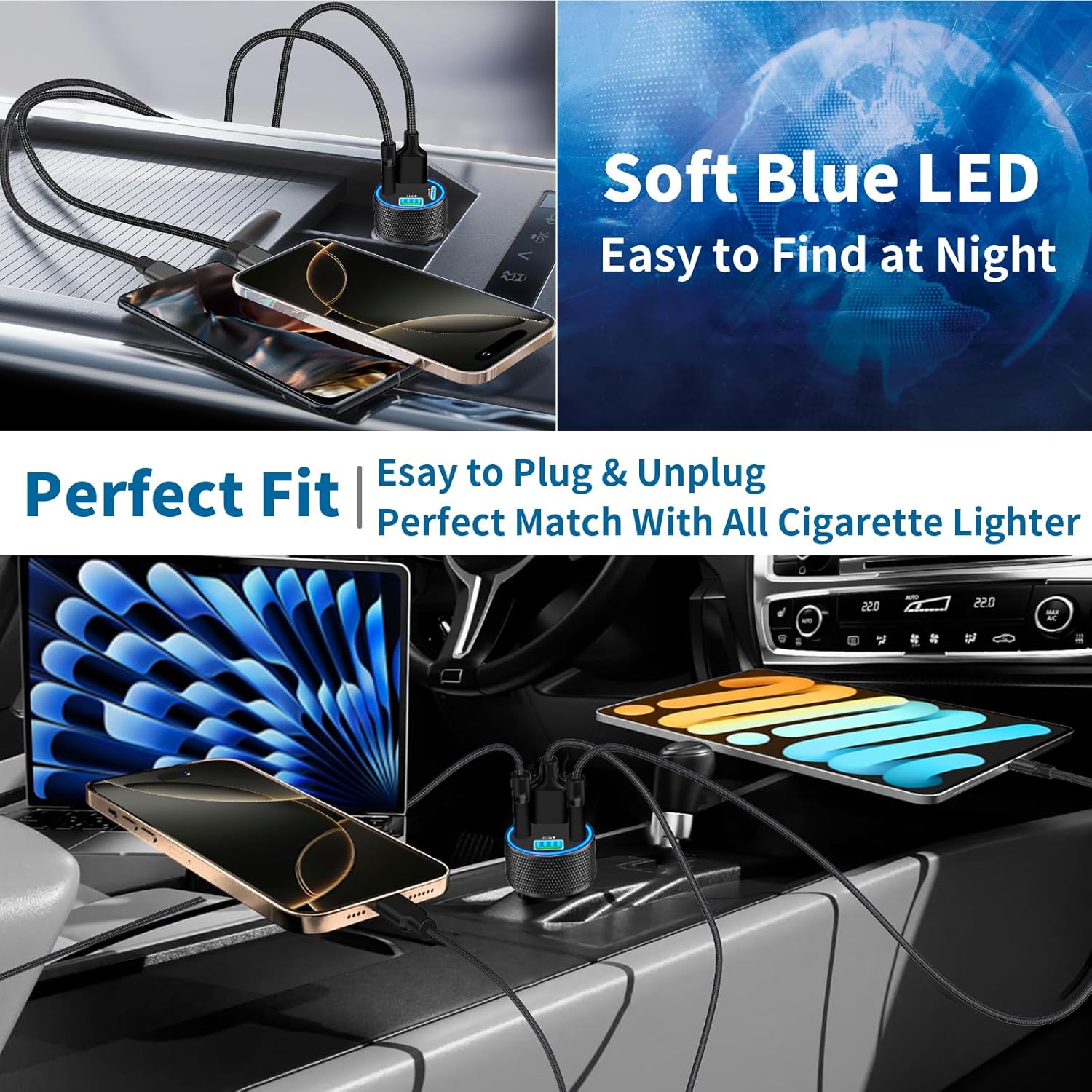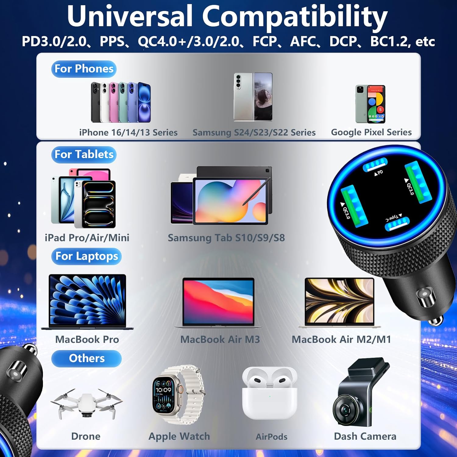 【Universal Compatibility】: Suitable for all 12V/24V small cars and large truck sockets, Compatible with: iPhone 17/17 Air/17 Pro/17 Pro Max/16/16 Plus/16 Pro/16 Pro Max/15/15 Plus/15 Pro/15 Pro Max/14/14 Plus/14 Pro/14 Pro Max/13/13 Mini/13 Pro/13 Pro Max/12/12 Mini/12 Pro/12 Pro Max/11/11 Pro/11 Pro Max/XR/XS/XS Max/X 8 7 6 5/iPad, Galaxy S25/S24/S23/S22/Note 20/10, Pixel, Moto, Tablet and more. Our car charger can also charge Cameras, GPS, Power Banks, Driving Recorders, Drone, etc.