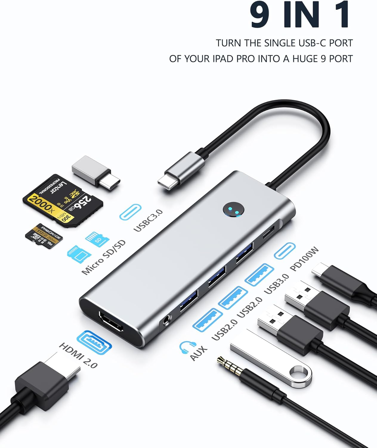 Massive Expansion: Turn your iPad Pro’s single USB-C port into a huge 9 ports. With HDMI port, a USB-C PD port, 3.5mm headphone jack, a USB-C Data port, 3 USB 3.0 port, and an SD/microSD card reader, you have everything you’ll ever need.