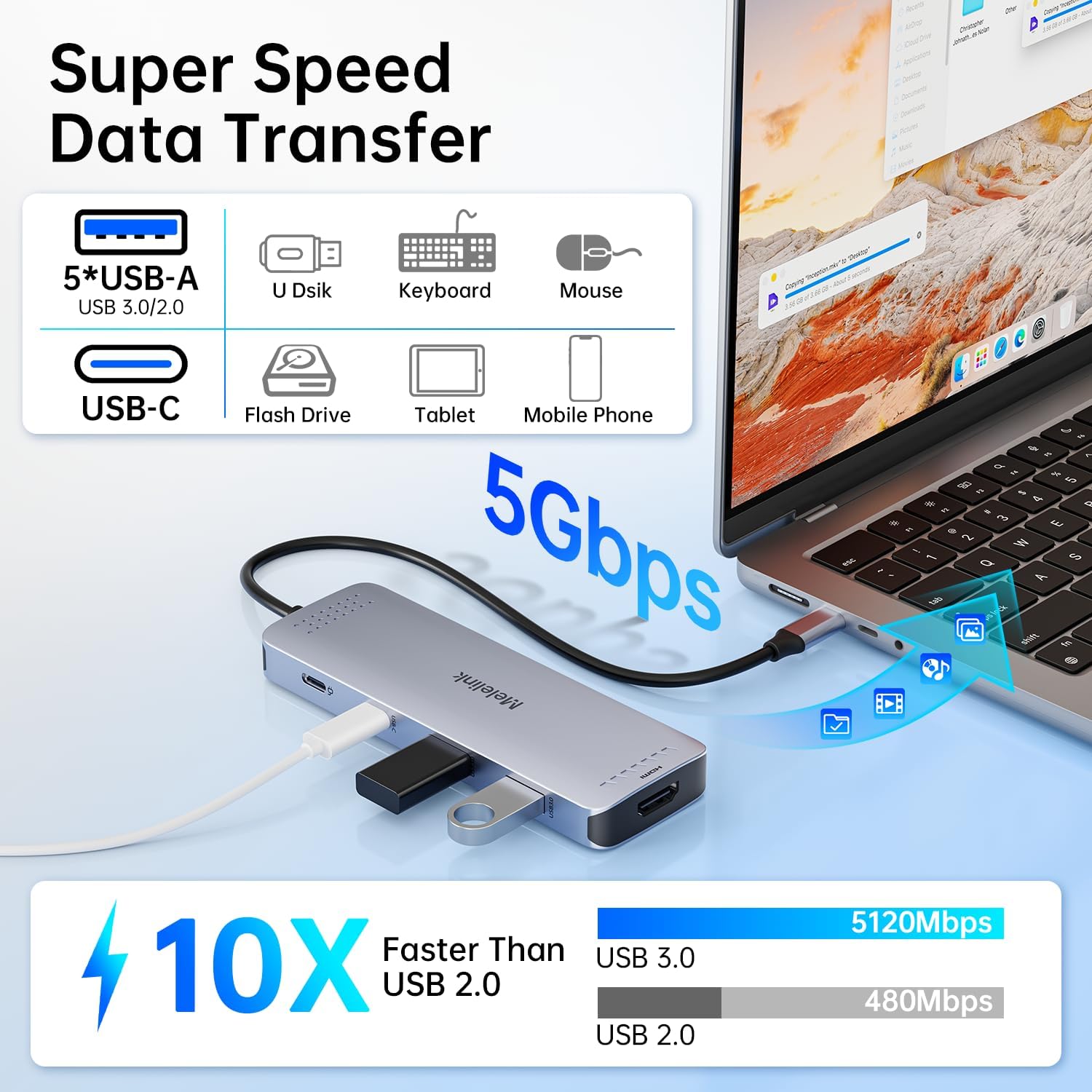 USB-C Hub Multiport Adapter (10-in-1): This versatile USB-C to HDMI adapter features a 4K@60Hz HDMI port, 2x USB 3.0 ports, 3x USB 2.0 ports, 1x USB-C data port, 100W PD charging, and Micro SD/TF card reader. This usb c adapter is an ideal for most laptops, tablets, and phones with USB-C/Thunderbolt 3/Type-C port. Such as: MacBook Pro/Air (2018-2025, M1/M2/M3/M4), iMac, iPad Pro, iPhone 15 Pro/Pro Max, Dell, Lenovo, HP laptops with usb c full function port.
