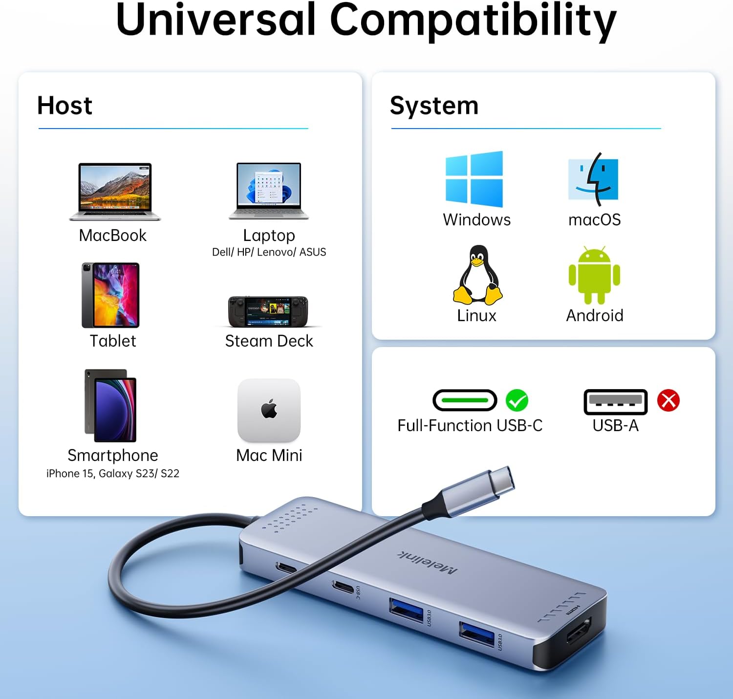 USB-C Hub Multiport Adapter (10-in-1): This versatile USB-C to HDMI adapter features a 4K@60Hz HDMI port, 2x USB 3.0 ports, 3x USB 2.0 ports, 1x USB-C data port, 100W PD charging, and Micro SD/TF card reader. This usb c adapter is an ideal for most laptops, tablets, and phones with USB-C/Thunderbolt 3/Type-C port. Such as: MacBook Pro/Air (2018-2025, M1/M2/M3/M4), iMac, iPad Pro, iPhone 15 Pro/Pro Max, Dell, Lenovo, HP laptops with usb c full function port.