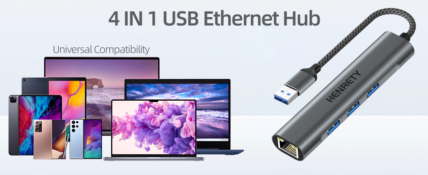 The USB Ethernet Adapter expand 3 USB 3.0 port to connect more, 4 in 1 USB 3.0 to Ethernet adapter features a 1000Mbps RJ45 gigabit port. And all hub ports can work simultaneously.