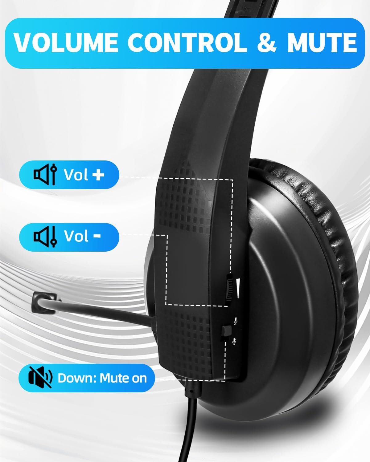 【VOLUME CONTROL & MIC MUTE】- There is a volume control on the back of the headset and is very easy to control. You can easily mute your calls and show your work status to your colleagues at any time, and maximize your work efficiency!