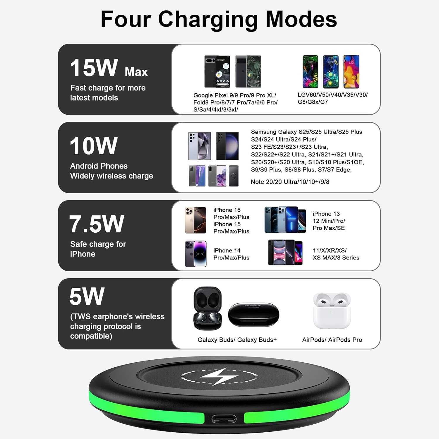 15W Fast Charging Mode: For Google Pixel 9A/9/9 Pro XL/9 Fold/8a/8/8 Pro/7a/7 Pro/7/6/6 Pro/5/4/4XL/3/3XL ,Motorola Moto G 5G 2024 2025//Moto edge 50 fusion/Moto edge 50 ultra/Moto edge 50 pro/Motorola Moto G Stylus 5G/Moto G Power 5G/Moto G Play 5G 2024/Moto Razr 2025 10W Fast Charging Mode: For Samsung Galaxy S25 Ultra/S24 FE/S24 Ultra/S24 Plus/S23 Ultra/S23+/S23/S22 Ultra/S22+/S22/S21 FE/S21/S21 Plus/S21 Ultra/S20/S20 Plus/S20 Ultra/S10/S9/S8, Note 20/10/9 7.5W Fast Charging: For iPhone 16/16 Pro Max/16 Plus/15/15 Plus/15 Pro/15 Pro Max/14/14 Plus/14 Pro/14 Pro Max/13/13 Mini/13 Pro/13 Pro Max/12/12 Mini/12 Pro/12 Pro Max/11/11 Mini/11 Pro/11 Pro Max/XS/XS Max/XR/X/8 5W Standard Charging Mode For Galaxy Buds;Other devices