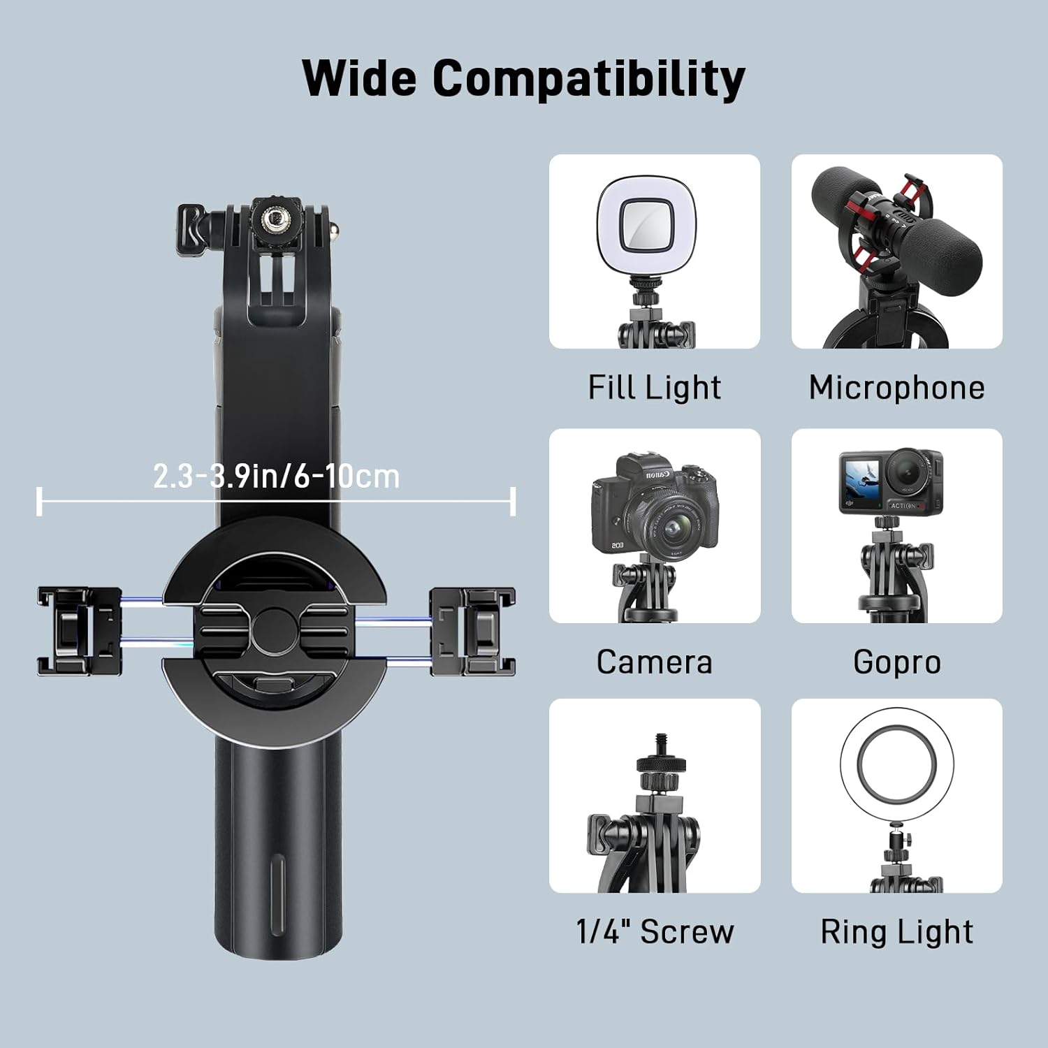 Universal Compatibility: This tripod for phone is compatible with iPhones, Android devices, and MagSafe cases. It attaches magnetically to MagSafe-enabled phones, while non-magnetic models can be securely held using the built-in phone clamp of the tripod. The standard 1/4-inch screw mount also makes it compatible with mini cameras, micro DSLRs, sports cameras, video lights, and more