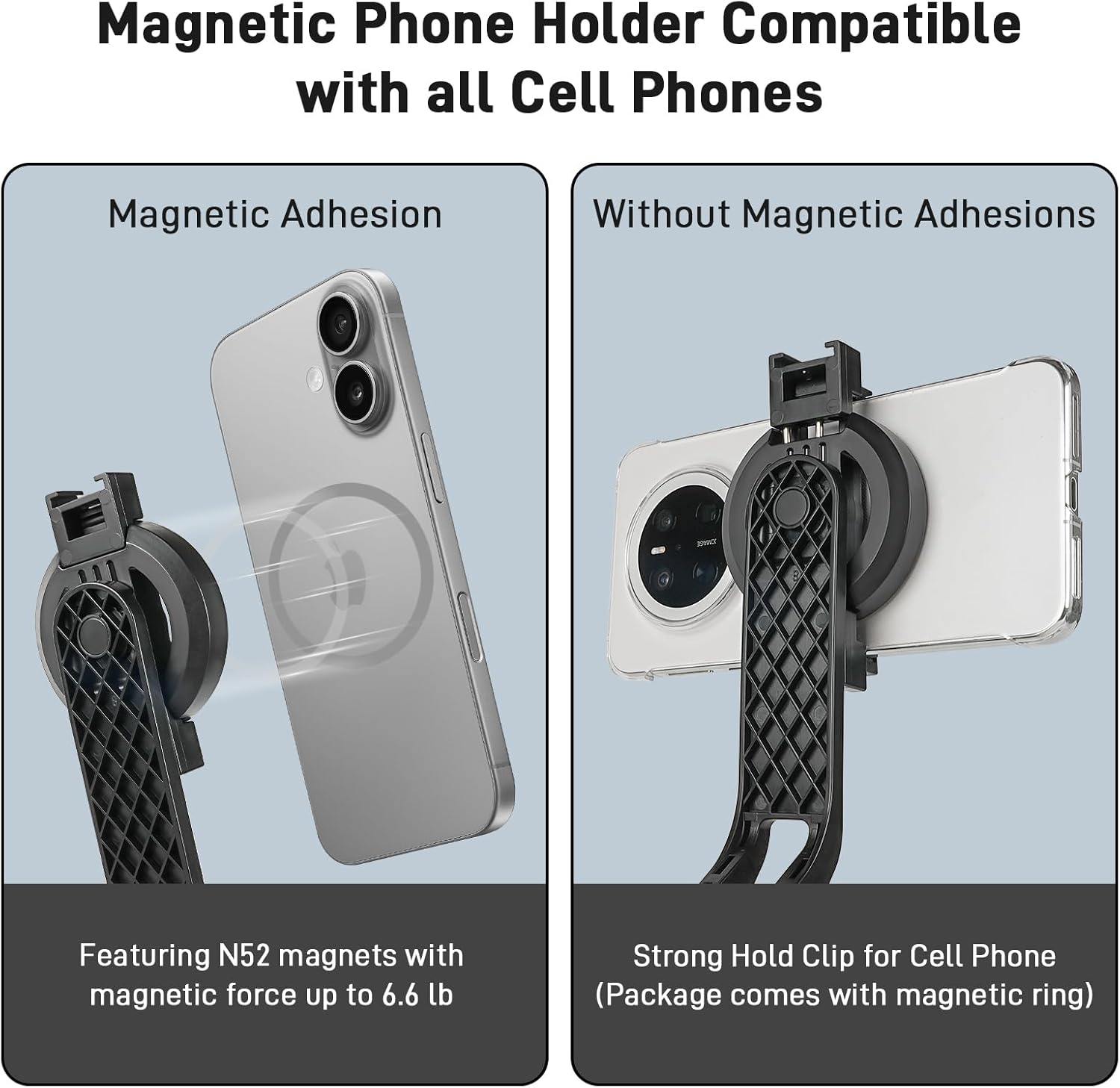 Powerful Magnetic Phone Tripod: Enjoy ultra-strong magnetic attraction for a secure, shake-free grip on iPhone 16/15/14/13/12 series and Magsafe Cases. Easily switch to the adjustable clamp for a firm hold on any smartphone, allowing you to capture your best moments with ease and stability