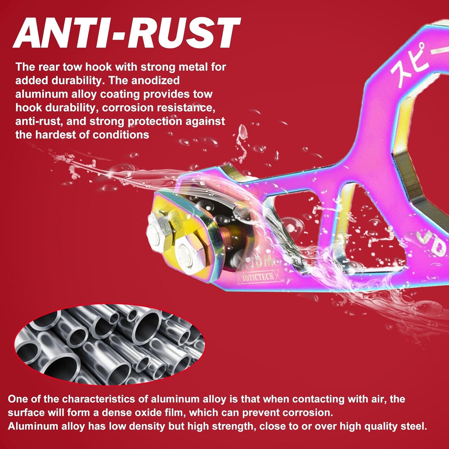[Premium Material] Our Rear Tow Hook is made of high quality Aluminum Alloy with high strength characteristics.The anodized aluminum alloy coating provides tow hook durability, corrosion resistance, anti-rust, and strong protection against the hardest of conditions.