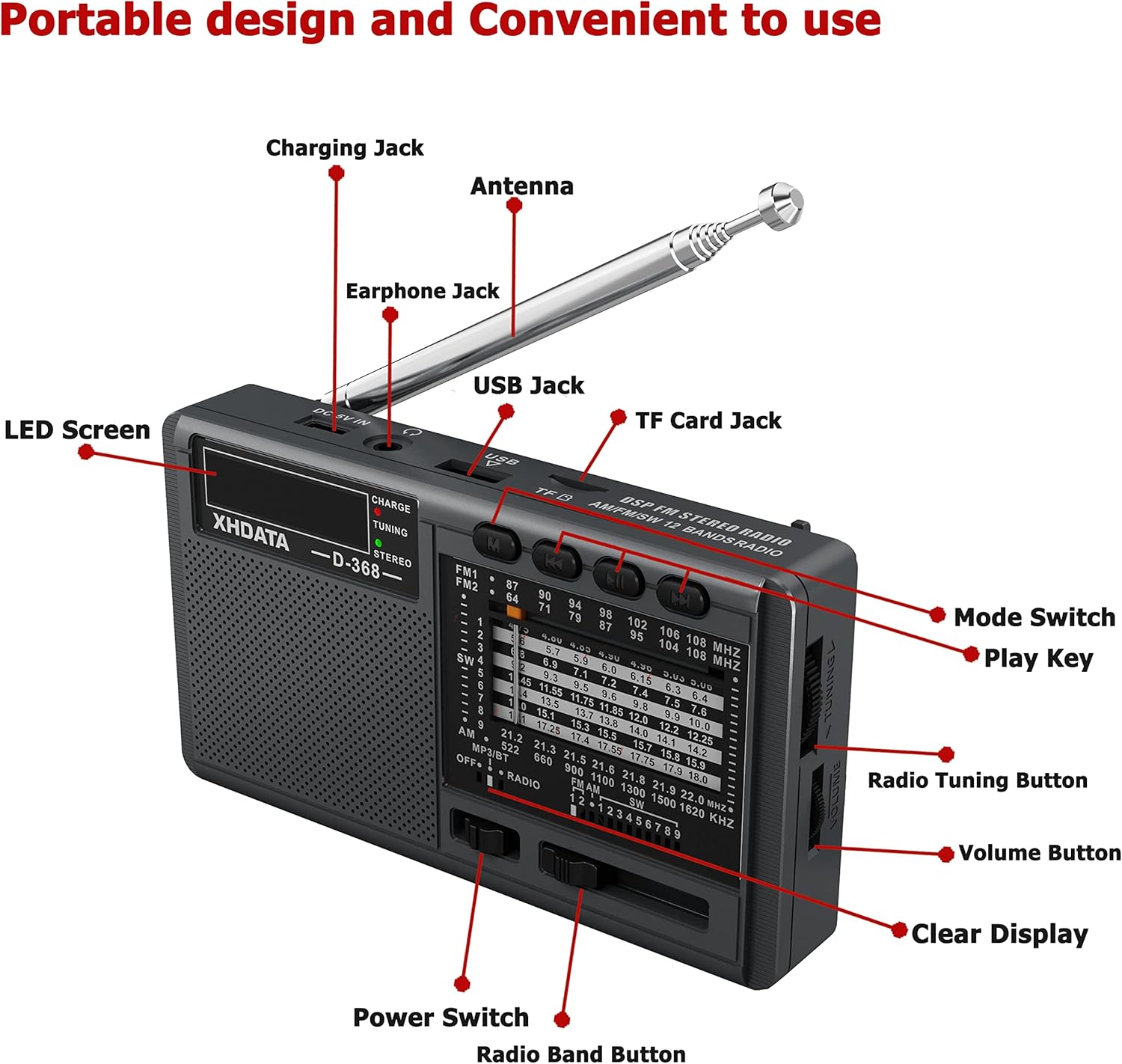 With 21.6 inch retractable antenna, you can rotate it 360° and receive stations with high sensitivity.