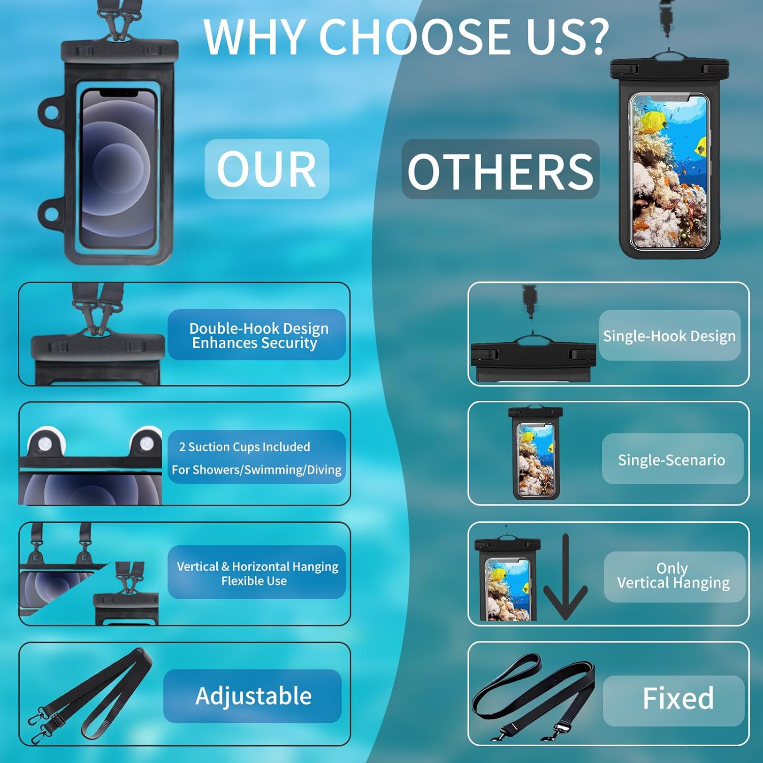 [SHOWER PHONE HOLDER WATERPROOF] with 2 Suction Cups is a versatile waterproof pouch designed to securely mount your phone on any smooth surface like glass, mirrors, or tiles. Stick it near your shower, tub, gym equipment, or kitchen counter to keep your phone handy and protected from water, splashes, and grime during bathing, relaxing, workouts, or cooking—crafted from premium PVC material, it ensures flawless touchscreen sensitivity so you can easily use Face ID, make calls, or interact with your phone while it stays perfectly dry and safe inside the pouch.