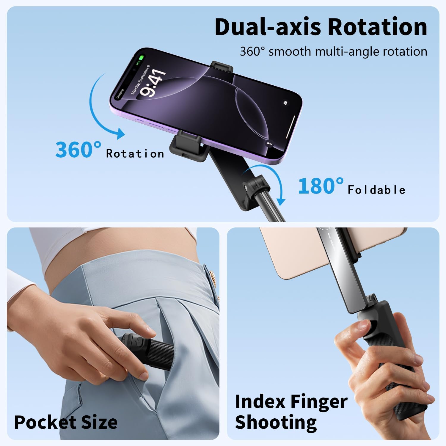 【Dual-axis Rotatable Design】 This phone tripod with remote can rotate 360°, which is very flexible to adjust the shooting angle. The clamp width of the small phone tripod is 2.36-3.74 inches, which is perfectly compatible with all mobile phones and is a perfect portable selfie stick for Android/iOS