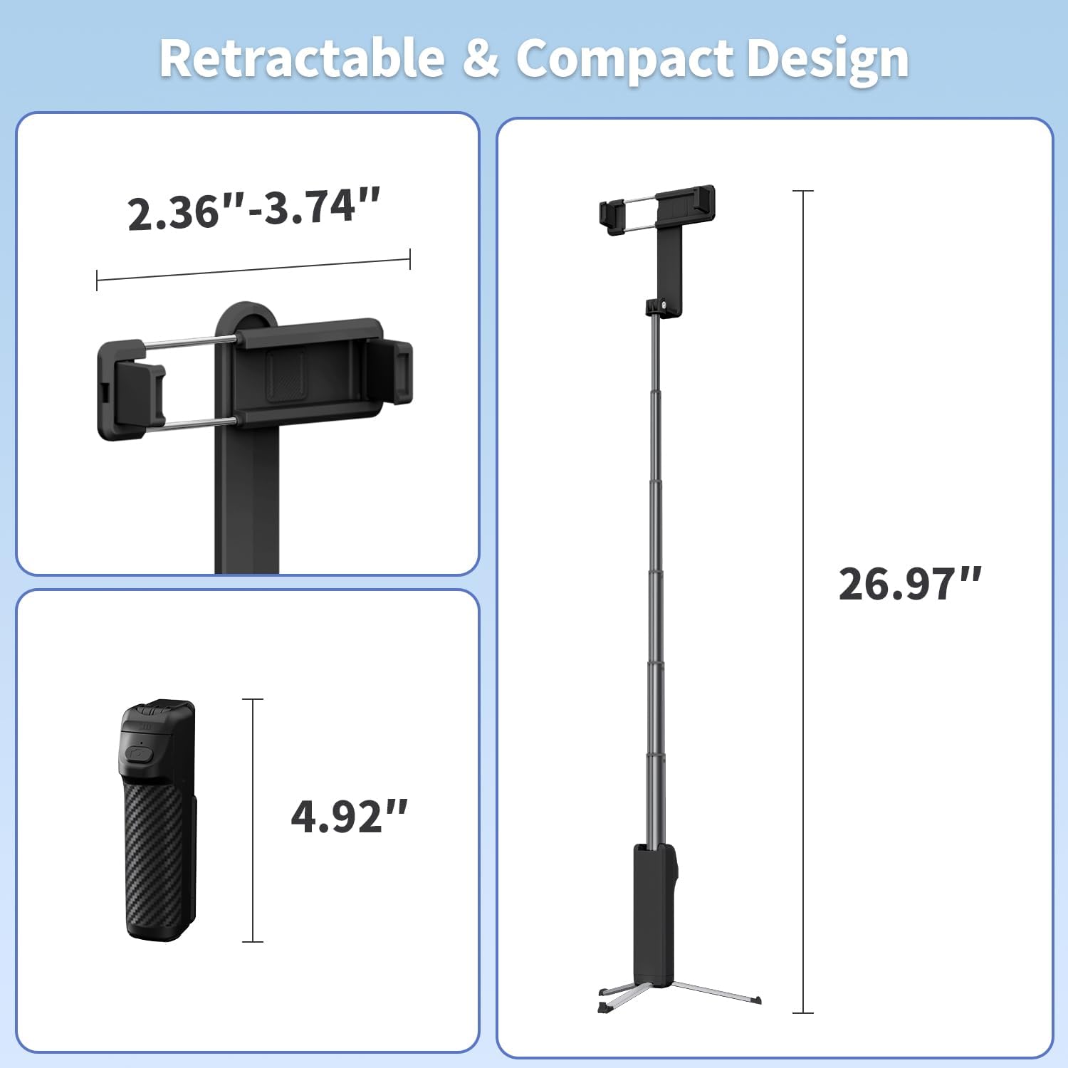 【New Mini Selfie Stick for iPhone】 This new iphone selfie stick is made of high-quality aluminum alloy material and has a built-in selfie tripod. The mini tripod for iphone adopts an integrated retractable design and can be extended to 26.77 inches, allowing you to achieve ultra-wide-angle free shooting